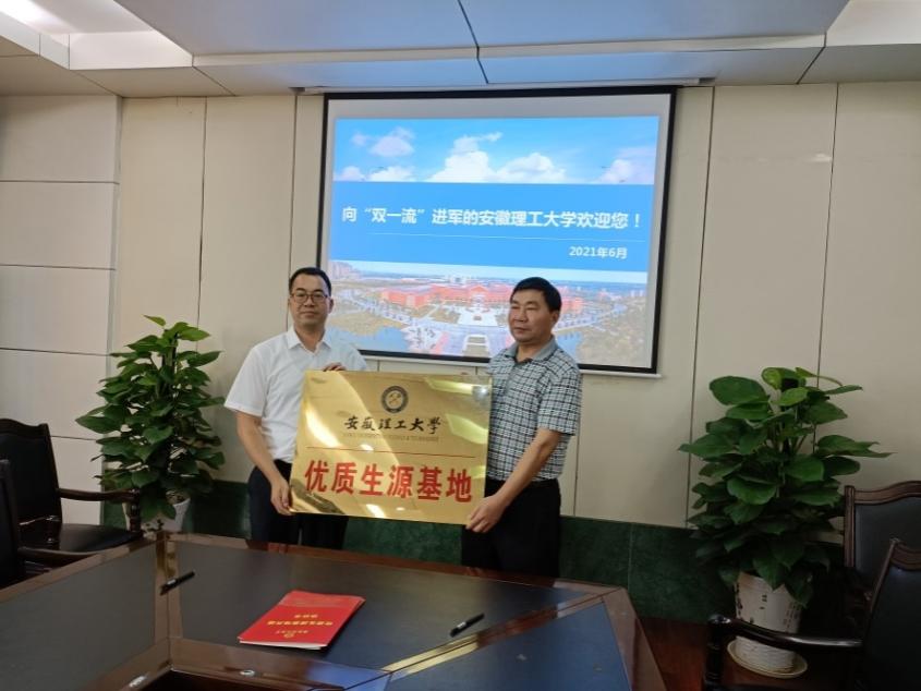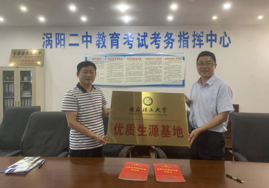 杨科、张向林分别代表学校与安庆市第一中学、涡阳县第二中学签署了《安徽理工大学优质生源基地共建协议书》,并举行了优质生源基地授牌仪式。