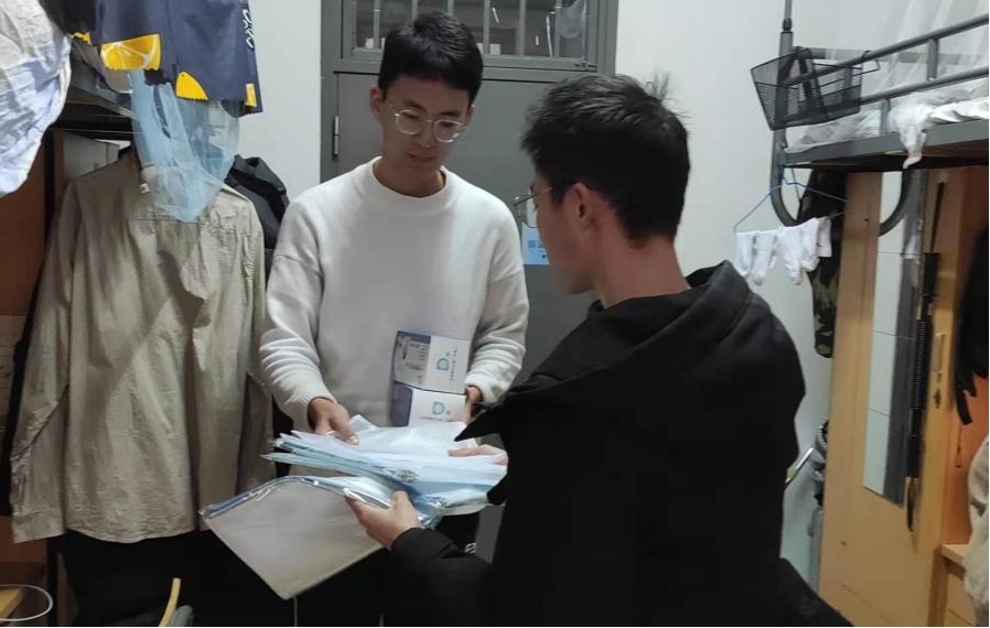 为考生发放考试袋和口罩(摄影:李恒硕)