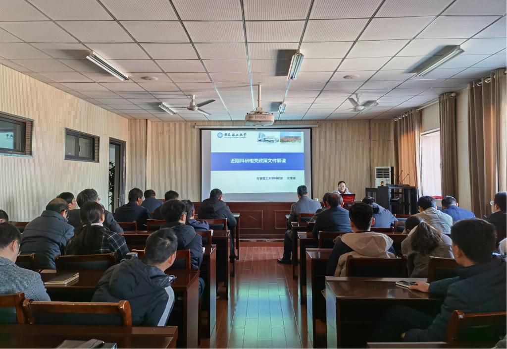 科研部副部长沈豫浙为学院教职工解读了近期科研相关政策文件,特别是《安徽理工大学国家科学基金专项激励办法(试行)》对获批项目指导教师、学院及个人的奖励政策,《安徽理工大学纵向科研项目经费使用“包干制”管理办法(试行)》中经费使用负责人承诺制及绩效提取的相关管理规定,《安徽理工大学校内经费资助科研项目管理办法(2021年修订)》对省高校自然科学与人文社会科学研究项目、校青年基金项目、校专利转化培育项目的资助额度和项目申报立项情况,并传达了学校实施科研诚信、加强科研活动记录与科研档案管理的相关要求。