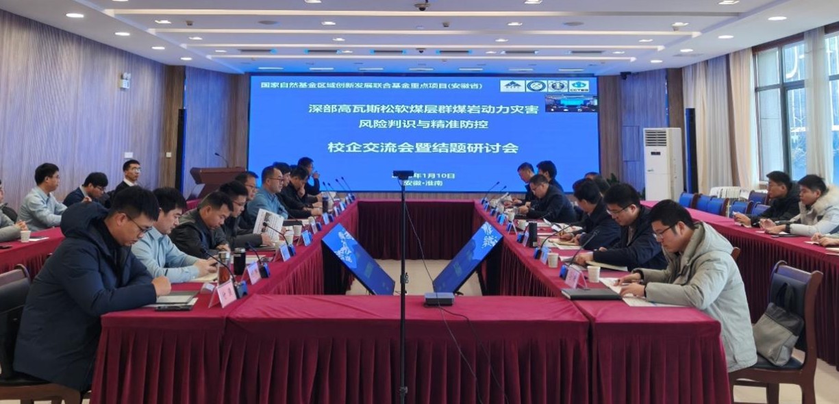 1月10日,由安徽理工大学牵头,联合中国矿业大学和中煤科工集团重庆研究院承担的国家自然科学基金区域创新发展联合基金重点项目“深部高瓦斯松软煤层群煤岩动力灾害风险判识与精准防控”(简称“联合基金”)校企交流会暨结题研讨会在学校召开,能源安全与清洁利用学部常务副主任华心祝、校科研部副部长鲁海峰出席。校企交流会由项目负责人杨科教授主持,中国矿业大学、中煤科工集团重庆研究院相关课题负责人、淮北矿业股份有限公司原技术中心主任陈贵、地测与通防部部长丁卫平,淮南矿业(集团)有限责任公司潘三矿矿长董瑞刚、朱集东矿总工程师丁永、丁集矿总工程师罗孝勇、宿州煤电(集团)有限公司界沟矿总工程师马跃、深部煤炭安全开采与环境保护全国重点实验室副主任任波和参研单位骨干30余人参加会议。