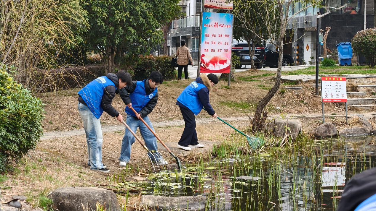 志愿者前往黎明社区开展水系清理志愿服务,仔细捡拾河道垃圾、清理岸边杂物,全力维护水环境整洁美观;在校园内开展植树护绿活动,认真栽种新苗、细心浇灌养护,为校园增添生机与绿意;对学院实验大厅进行全面清扫,规整物品、清除杂物,营造整洁有序、舒适便捷的学习科研环境,以实际行动践行绿色发展理念。