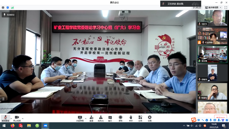 5月6日下午,矿业工程学院党委通过线上线下相结合的方式组织召开理论学习中心组(扩大)学习会,专题学习研讨党的十九届六中全会精神和习近平总书记在中国人民大学考察时的重要讲话精神。会议由学院党委书记盛鹏飞主持,学院党委委员、各党支部书记、系主任、科级干部和全体辅导员参加学习会。