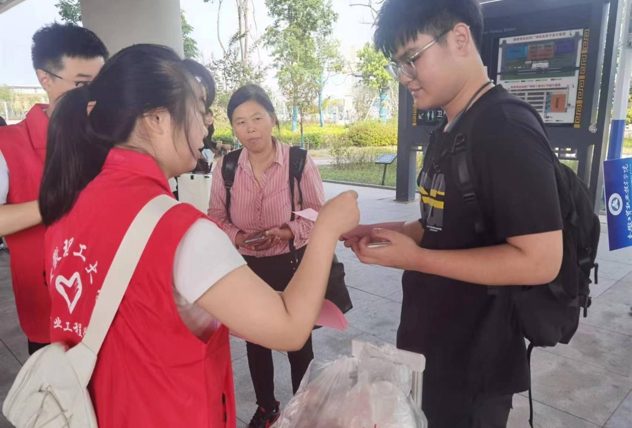 活动日当天,参与活动师生前往淮南南站出站口、淮南南站公交换乘中心等地,向安徽理工大学新生及家长发放宣传单、交通安全宣传标语,并通过现场讲解等方式教育学生关爱生命、拒绝违章,严防道路事故,共创文明校园。
