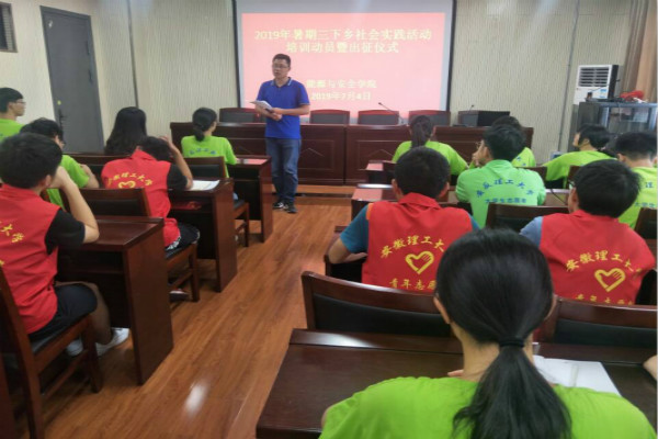 7月4日下午,能源与安全学院在宁远楼A410报告厅举行2019年大学生暑期“三下乡”社会实践队员培训暨出征仪式。各年级辅导员和60余名大学生志愿者参加。