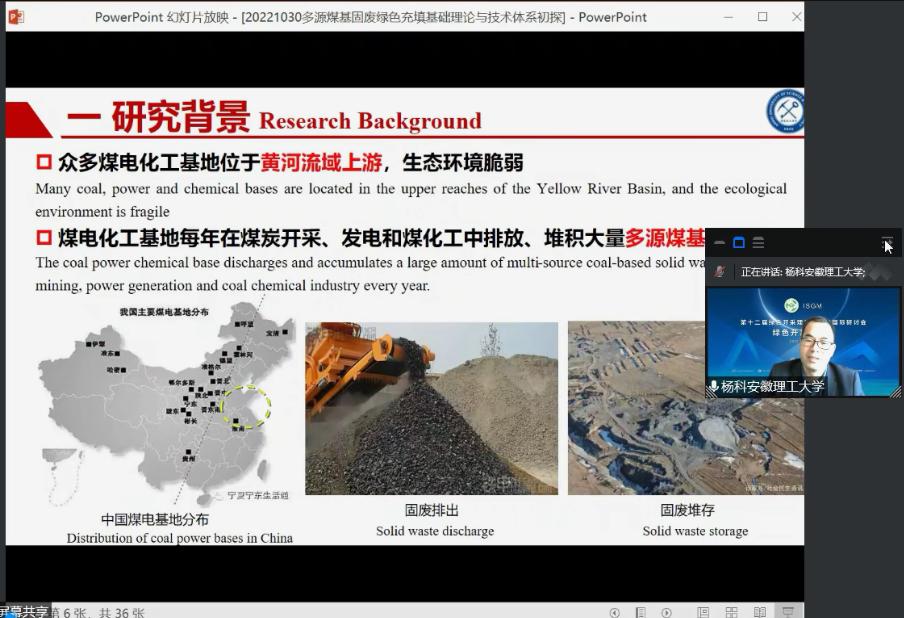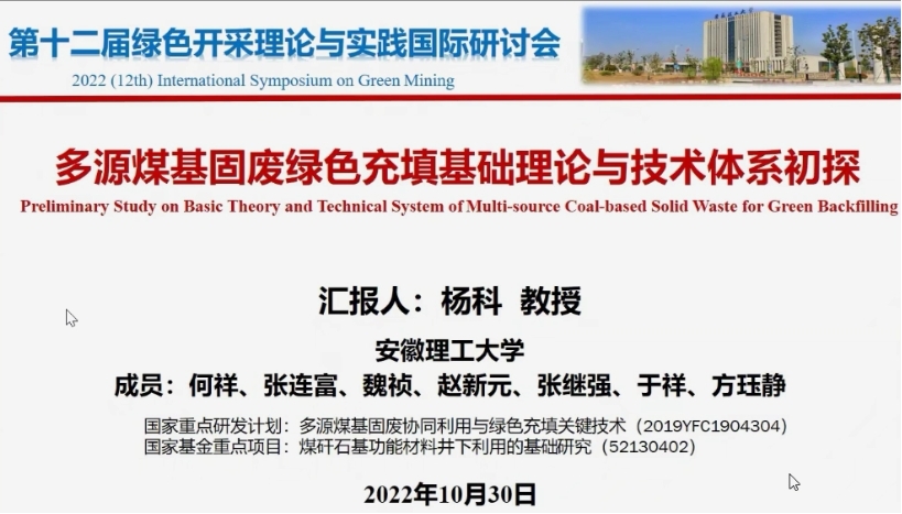 2022年10月29日-30日,由中国矿业大学主办,中国矿业大学-安徽理工大学冲击地压防治工程研究中心、中国矿业大学煤炭资源与安全开采国家重点实验室等单位联合承办的第十二届绿色开采理论与实践国际研讨会在线上召开。我校矿业工程学院院长杨科、煤基固废资源利用科研团队成员及部分教师、研究生参加了研讨会。
