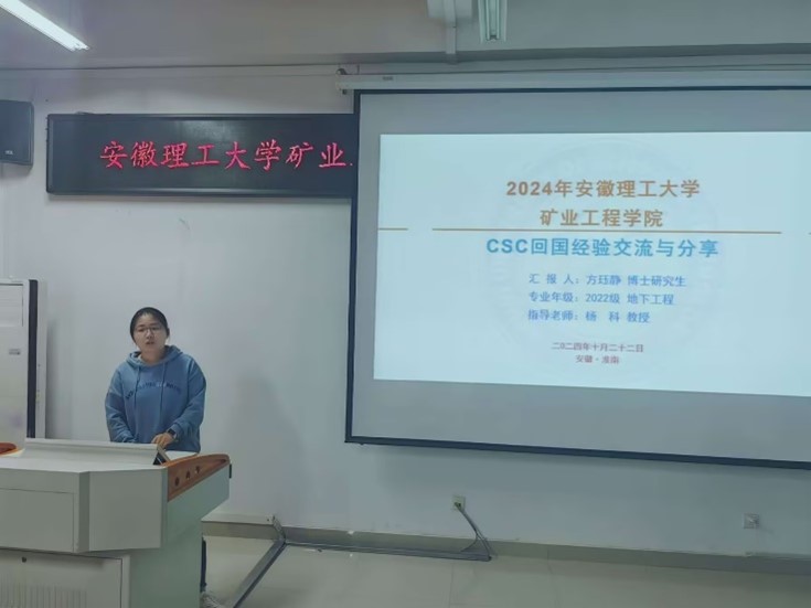为帮助研究生新生更好规划科研之路,进一步推进学院国际交流,10月22日下午,矿业工程学院在宁远楼A302教室召开学术科研经验暨国家公派联合培养博士生回国报告会。从澳大利亚西澳大学和阿德莱德大学联合培养归来的博士研究生方珏静和吕鑫分别就国家公派出国访学的流程、联合培养期间生活学习内容及收获体会进行深入细致分享。2024级研究生60余人参加报告会。会议由学院副院长殷志强教授主持。