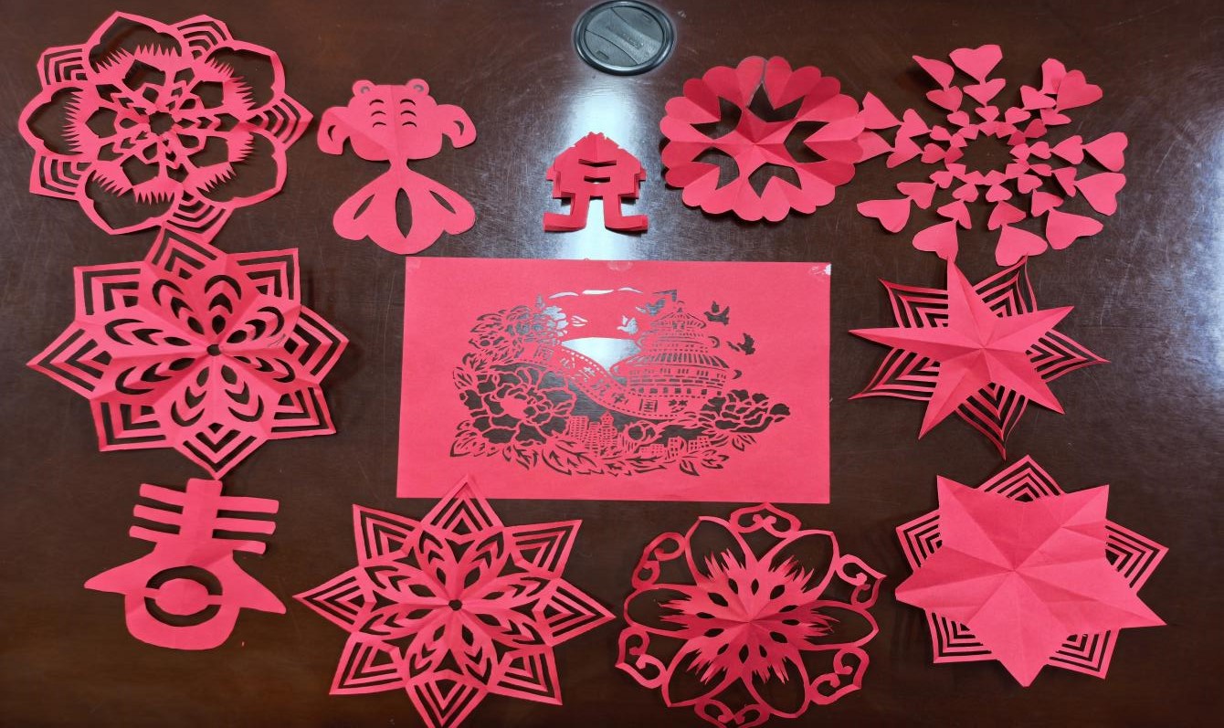 活动开始,老师为同学们普及剪纸的历史文化、图案寓意以及制作方法,并为大家分发纸、刻刀、剪刀等工具包。同学们手持剪刀,红纸翻飞,寥寥数剪便剪出栩栩如生的图案,一张张红纸变成了精美的剪纸作品,从花卉到动物,从寓意吉祥的传统符号到祖国现代化标志,每一幅作品都充分表达了同学们对生活的热爱,对祖国的赞美,令人赞叹不绝。