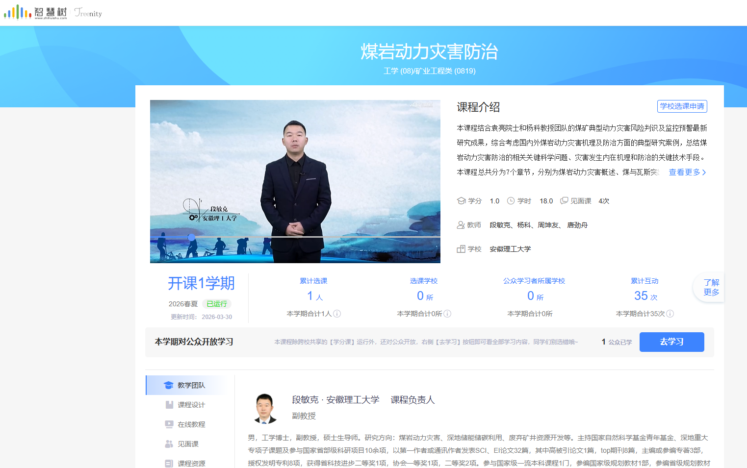近日,矿业工程学院段敏克副教授负责的安徽省新时代育人质量工程项目(研究生教育)线上示范课程《煤岩动力灾害防治》在智慧树平台正式上线运行,该课程教学团队由矿业工程学院煤岩动力灾害教研团队主要成员杨科、段敏克、周坤友、唐劲舟等组成。